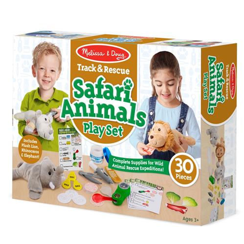 Kids will go wild for this 30-piece play set! Use the compass and red lens to follow paw-print tracks and go on safari to find and rescue three top-quality 8.5-inch plush pals (rhino, lion, and elephant). Treat ailments and injuries with realistic accessories, like bandages, a syringe, and an ointment tub, clip on ID ear tags, and reward with yummy treats. Keep track of equipment needed to go on rescue missions and expeditions, and learn fun facts about the animals with reusable activity cards!